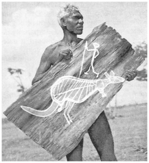 Дарактын кабыгына түшүрүлгөн кенгурунун сүрөтү менен ырым-жырымдар ды аткаруу учуру.